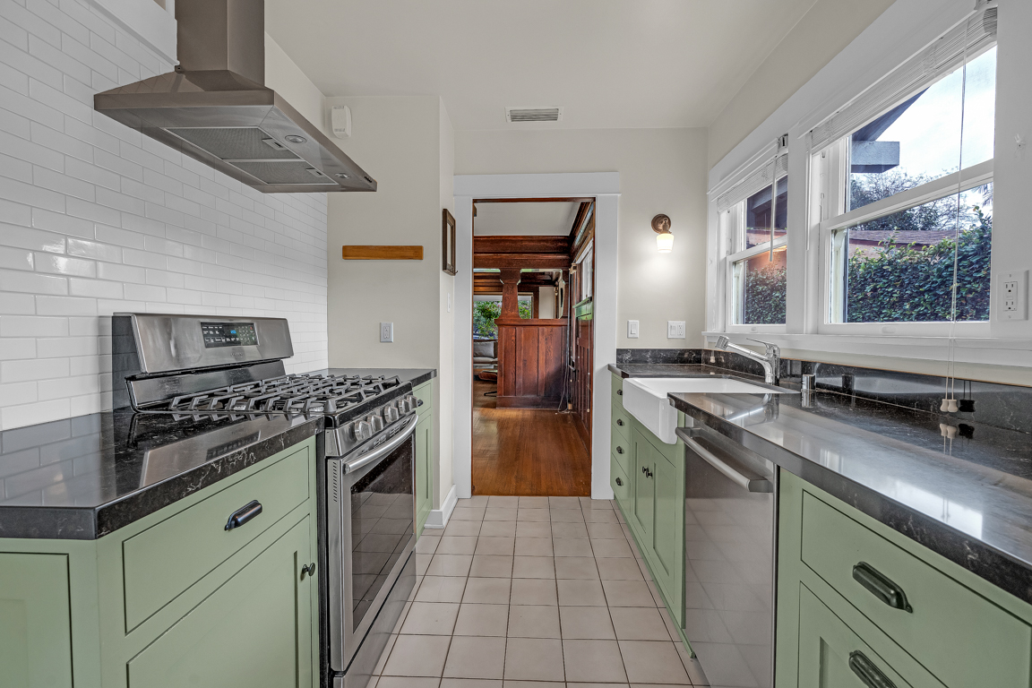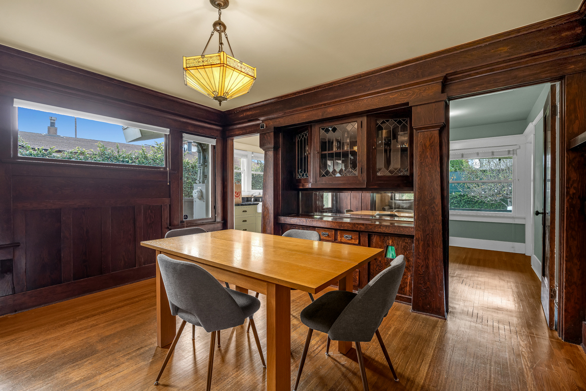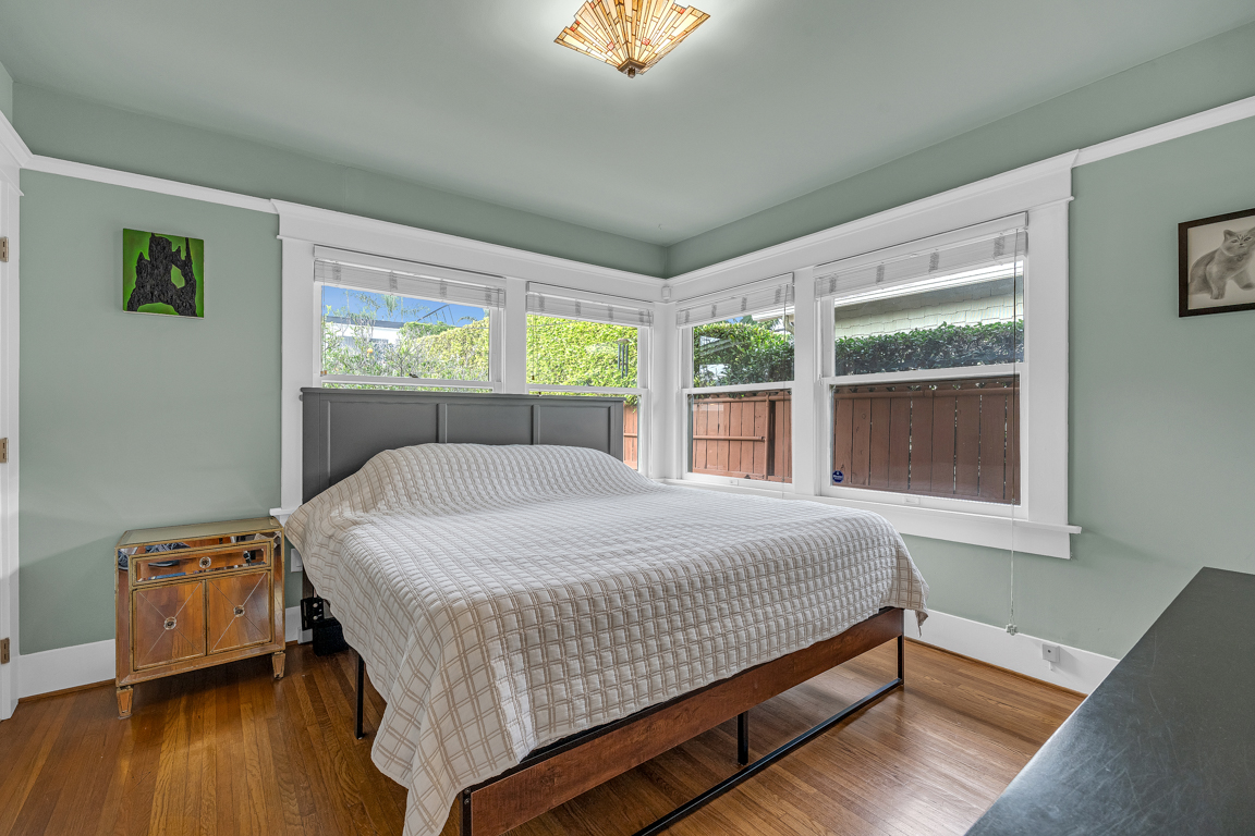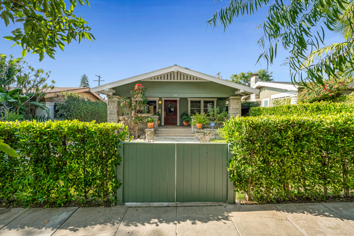 Most precious Craftsman home with its timeless woodwork character and thoughtfully preserved architecture, blends with refined modern renovations. This 3-bedroom, 2-bath charming picket fenced home has all original hardwood floors and hardwood archways, alongside modernized bathrooms. A gracious living room anchored by a decorative fireplace, leads to the dining room which boasts antique Victorian-style built-in cupboards, and an updated kitchen with farmers porcelain sink. Outdoors, a private landscaped yard with mature orange and fig fruit trees provides a tranquil retreat. Ideally positioned in a sweet neighborhood across from the De Longpre Park and set along a historic block of iconic Craftsman homes, this residence offers authentic charm, comfort, and an exceptional classic property.